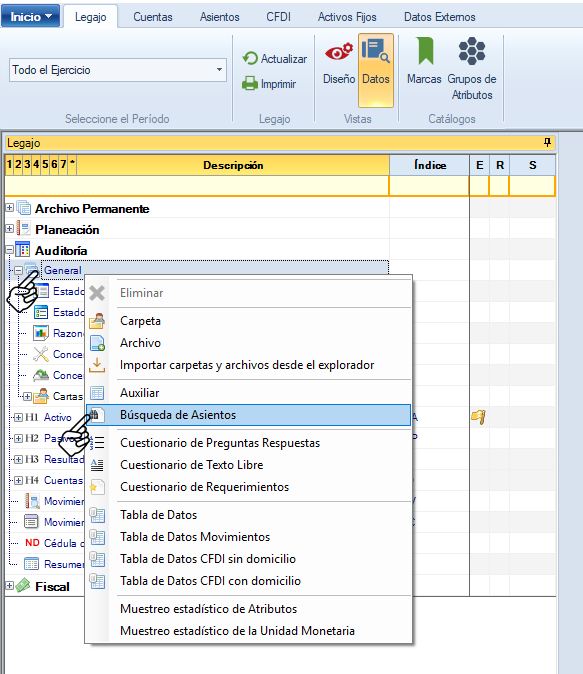 En "Legajo" selecciona con un clic el lugar donde necesitas insertar la búsqueda, en el ejemplo se dio un clic en "General", da clic con el botón derecho del mouse y selecciona del menú "Búsqueda de asientos".