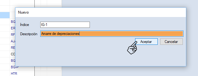 Se mostrará la siguiente ventana. Tienes la posibilidad de editar el índice proporcionado de forma automática. Captura la descripción y por último da clic en "Aceptar".