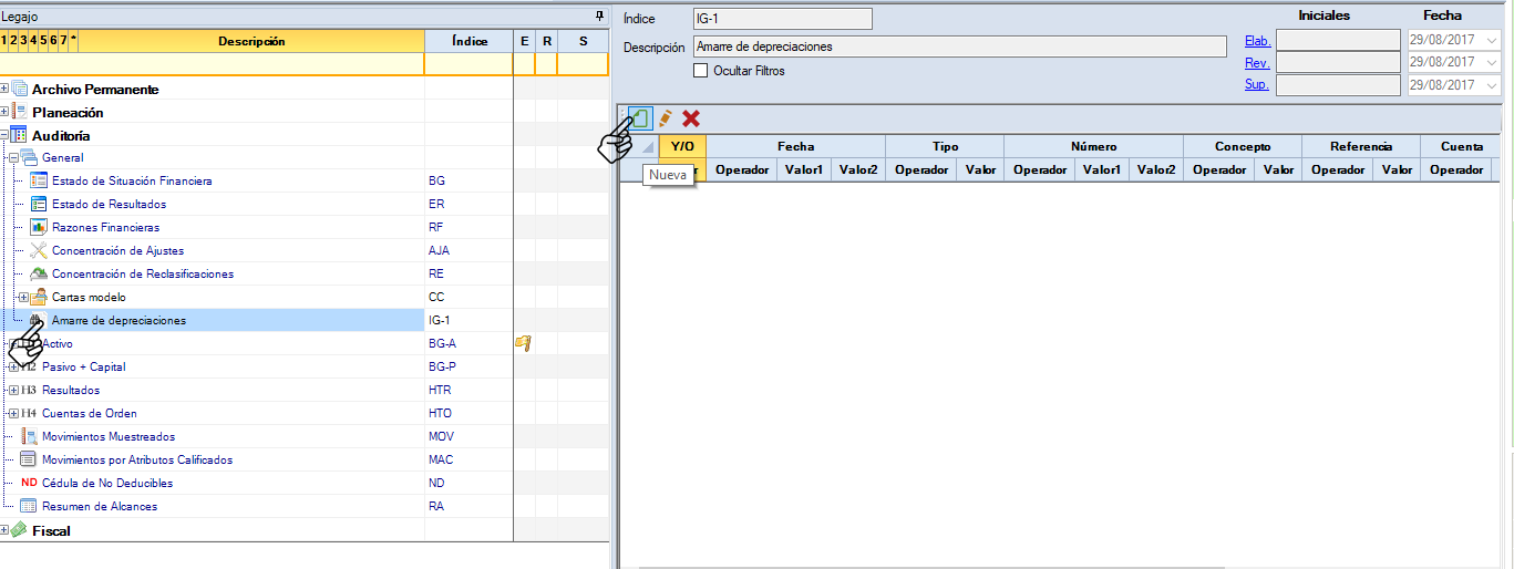 La búsqueda se inserta en el lugar indicado y se presenta del lado derecho del legajo. Da clic en el botón "Nueva" para iniciar a configurar la búsqueda.