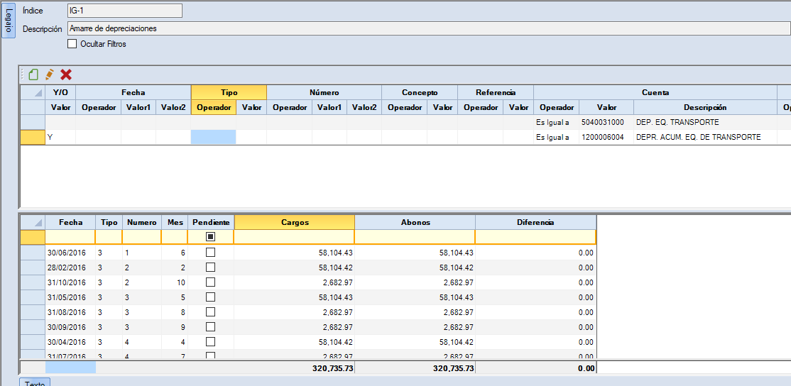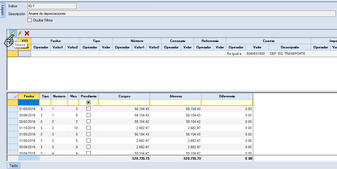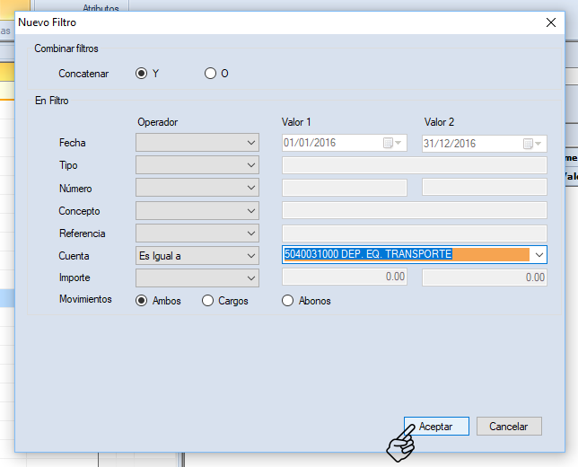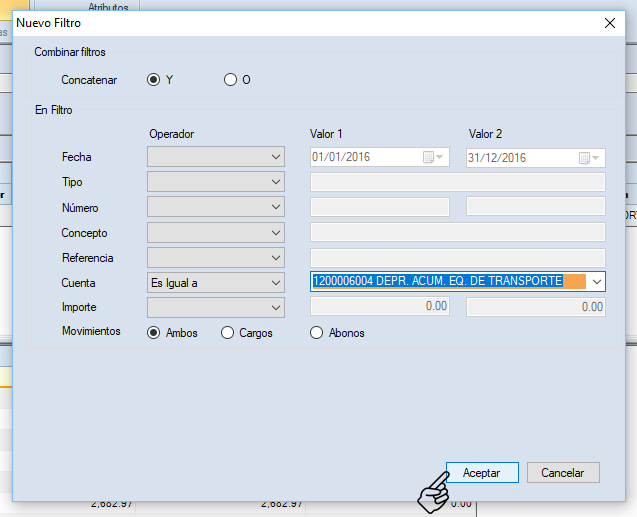 Configura lo que necesites para filtrar el primer elemento de la estructura de asiento que necesitas. En el ejemplo se busca que la cuenta sea igual a la 5040031000 DEP. EQ. TRANSPORTE. Da clic en "Aceptar".