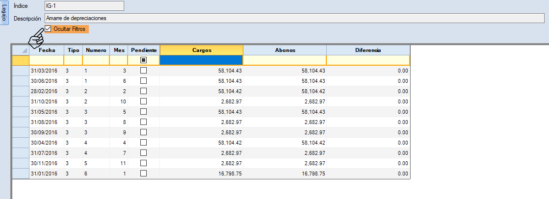 Puedes seleccionar el asiento que necesites revisar. Si no alcanzas a visualizarlo correctamente en la parte superior de la búsqueda tienes "Ocultar Filtros", que al activarlo te permitirá visualizar los asientos.