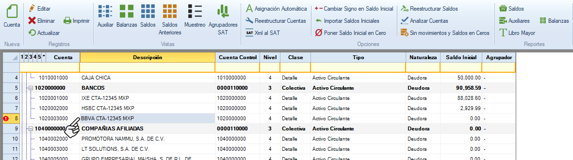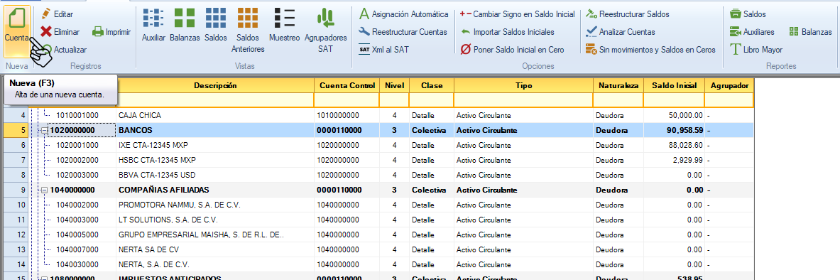 Para crear una o varias cuentas selecciona donde la necesitas. En el ejemplo se requiere una cuenta de detalle en "BANCOS". Da clic en el botón "Cuenta".