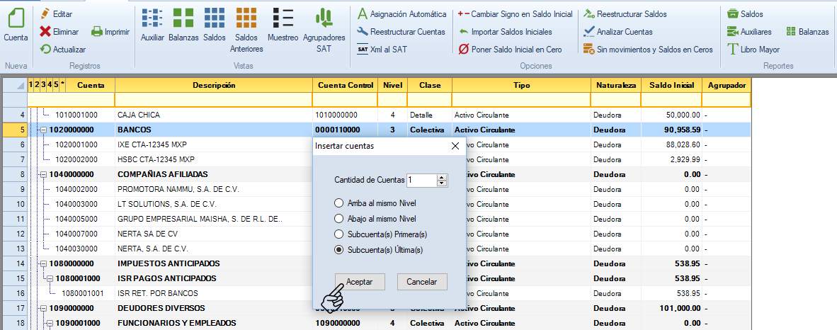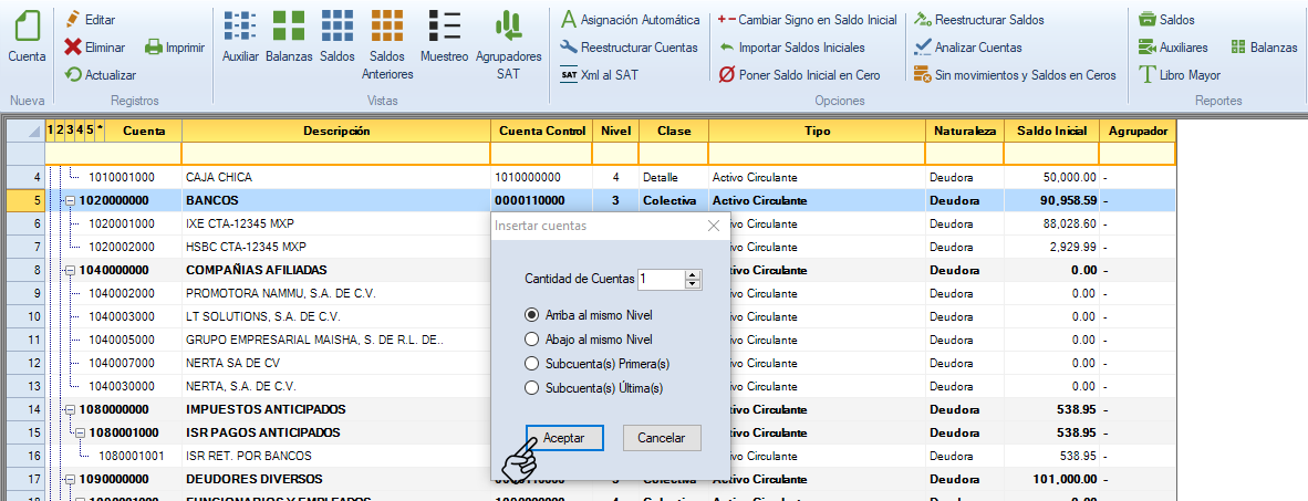 Arriba al mismo nivel: la cuenta o cuentas serán agregadas arriba de la cuenta seleccionada al mismo nivel.