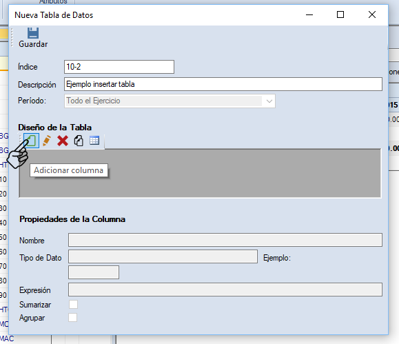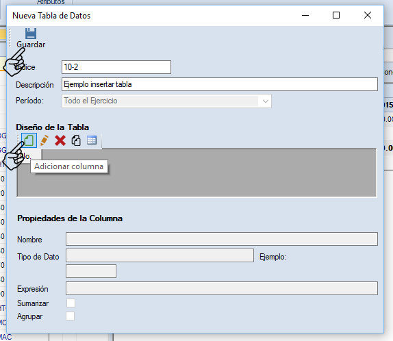 Para comenzar a crear las columnas da un clic en "Adicionar columna". Ten en cuenta que deberás colocar el tipo de dato que necesites en cada columnas que agregues. En el ejemplo se muestra la columna "No.", el tipo de dato es "Entero". La expresión no aplicará. No se considera deberá sumarizar la columna. Da clic en "Aceptar" para guardar los datos de la columna.