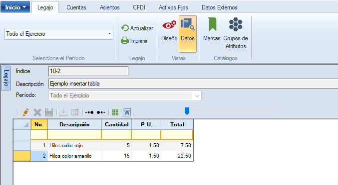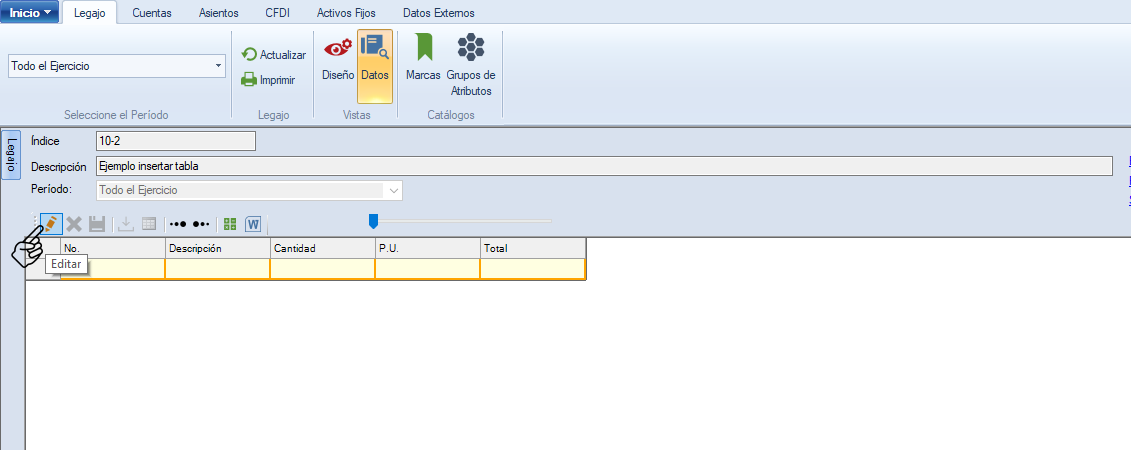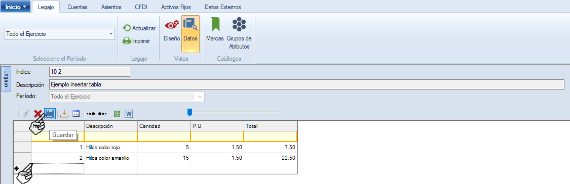 Se habilita la tabla para comenzar a capturar los renglones. Da clic sobre el elemento que vas a capturar para iniciar el ingreso de información. Al finalizar da clic en el botón "Guardar" para grabar los datos capturados.