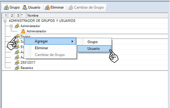 Para crear un usuario se debe seleccionar el grupo a dónde se necesita y dar clic botón derecho del mouse.