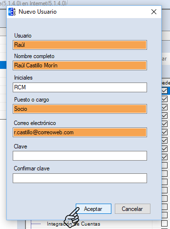 Al dar clic en "Usuario" se muestra la siguiente pantalla. Captura la información solicitada y da clic en "Aceptar". La clave es alfabética, numérica o alfanumérica.