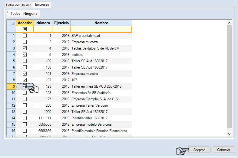 Por último da clic en "Aceptar" para guardar los parámetros que se acaban de configurar. Las empresas que no fueron habilitadas no podrán ser vistas por el usuario.