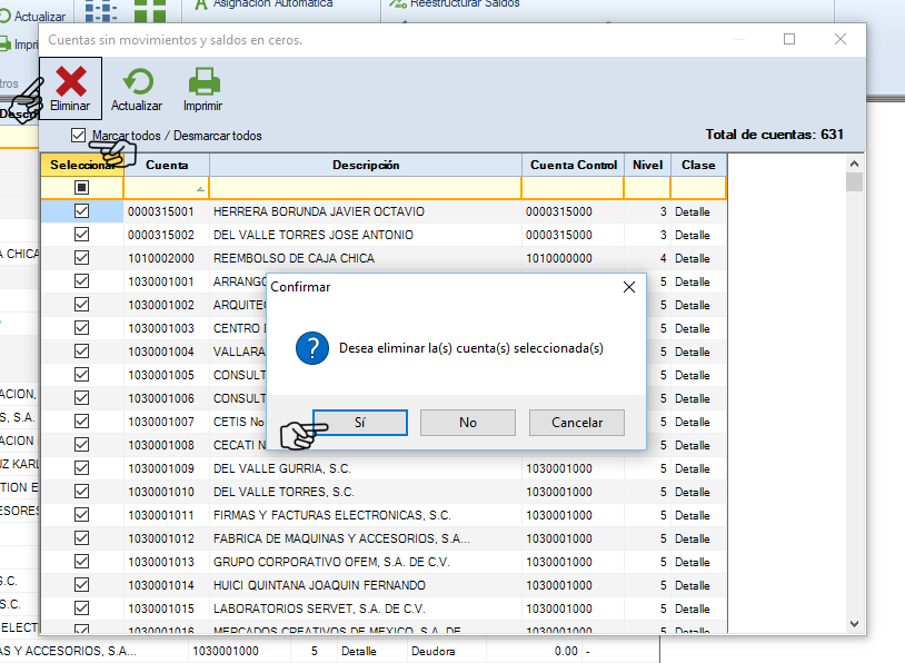 Da clic en el botón “Sin movimientos y Saldos en Cero”, y presentará la siguiente ventana. Para borrar todas habilitar sobre “Marcar/Desmarcar todos” y en seguida presionar “Eliminar”. Confirma si se está seguro de querer eliminarlas, indica “Sí”: