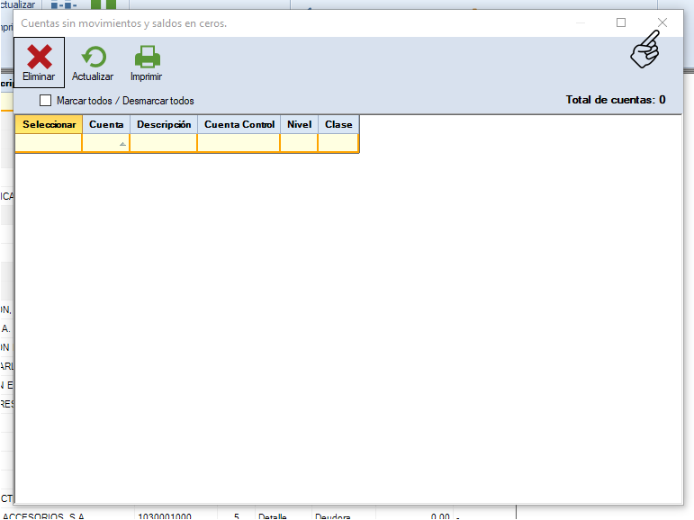 Una vez eliminadas las cuentas presenta la siguiente ventana: