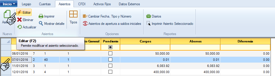 Modifica los elementos que necesites. En el ejemplo se da doble clic en los importes de cargos y abonos para modificarlos.