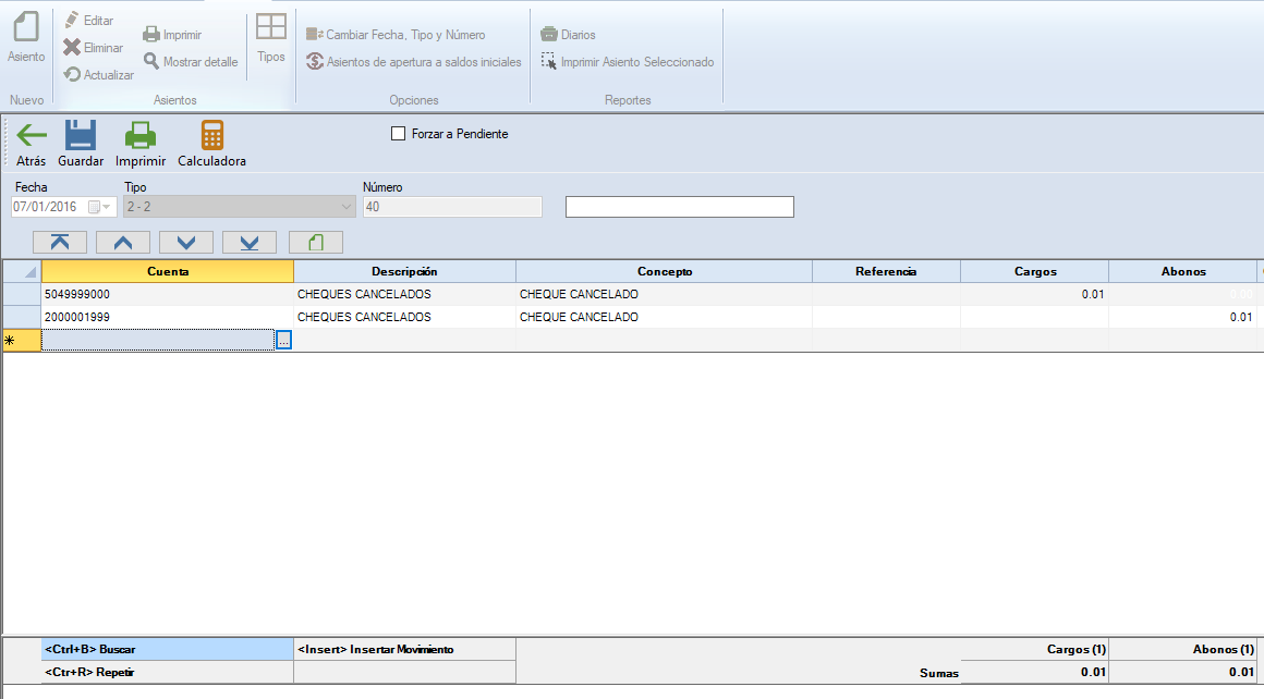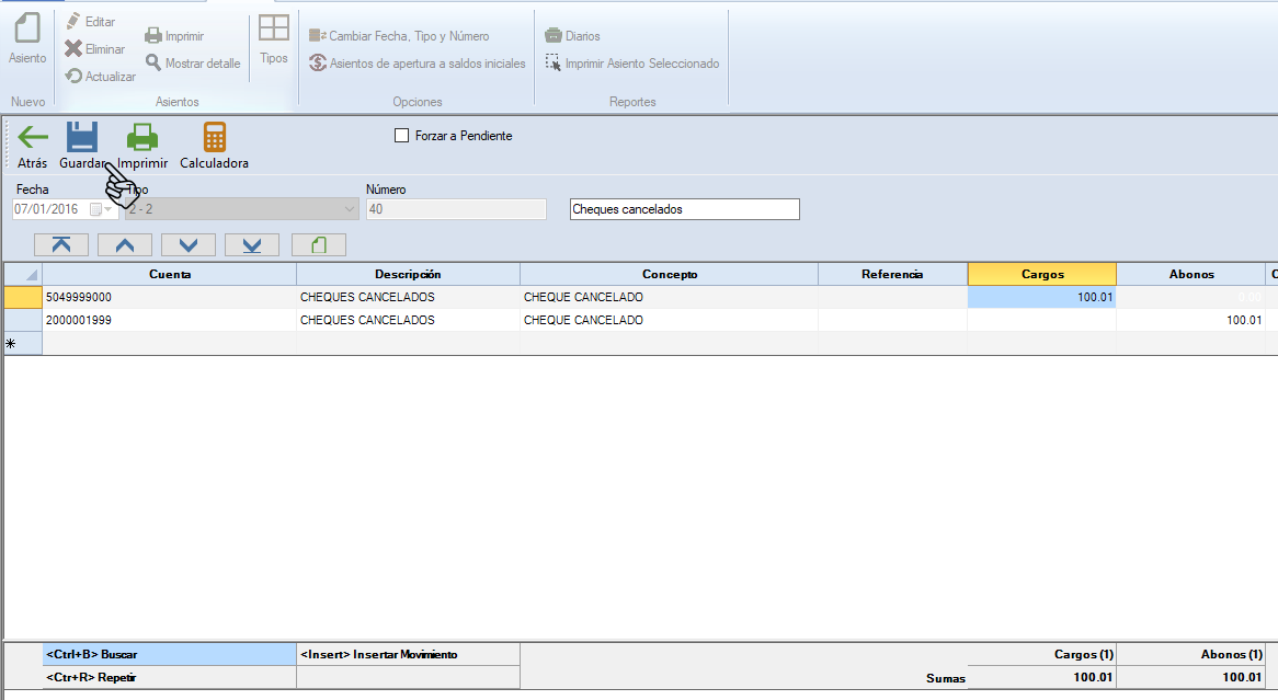 Si deseas dejar el asiento capturado, y que no afecte la contabilidad, da clic en "Forzar a Pendiente". Quedará guardado pero no se aplicará, por tanto, no verás esos movimientos en las balanzas, auxiliares, hojas de trabajo, sumarias e integraciones. En caso de haberlo puesto como pendiente y lo quieras mostrar en la contabilidad quítale "Forzar a Pendiente" y da clic en "Guardar".