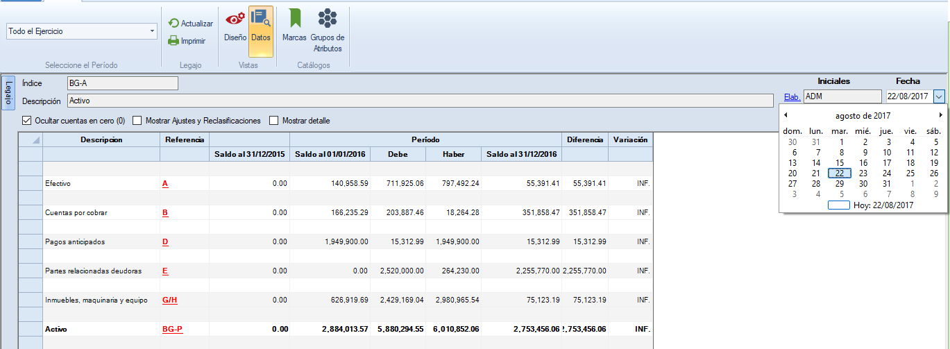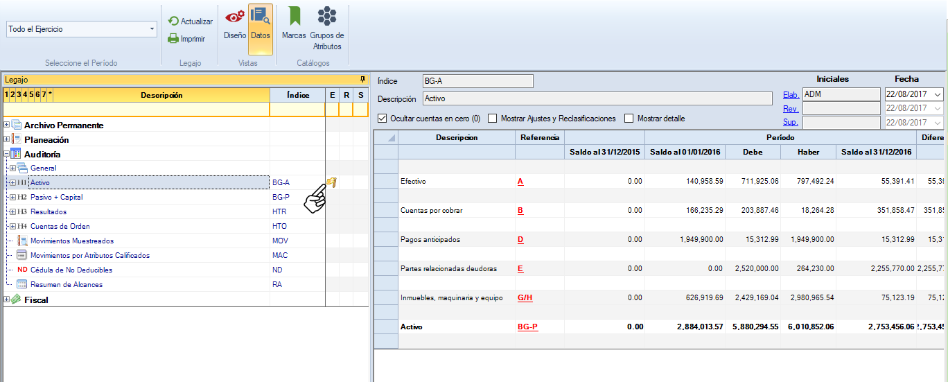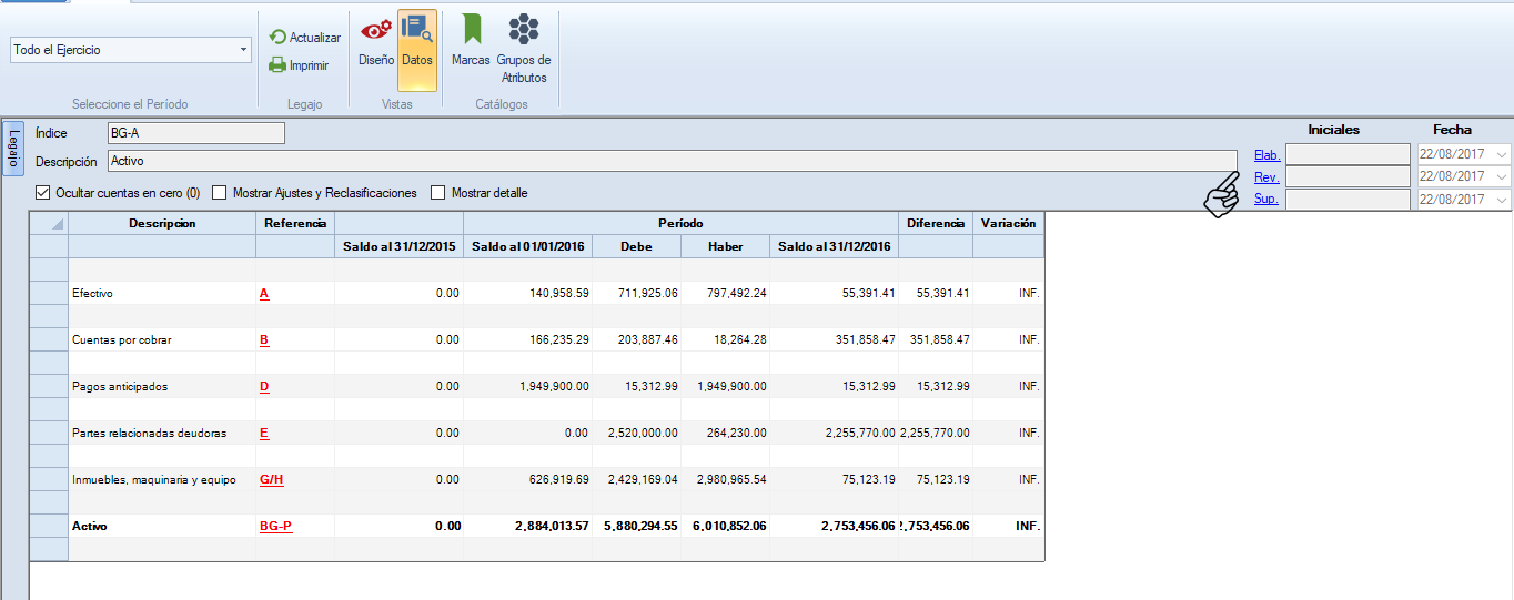 Da clic sobre "Elab.", si eres el usuario que elaboró el papel de trabajo, o en "Rev.", si eres quien lo revisó o en "Sup.", si eres quien supervisó.