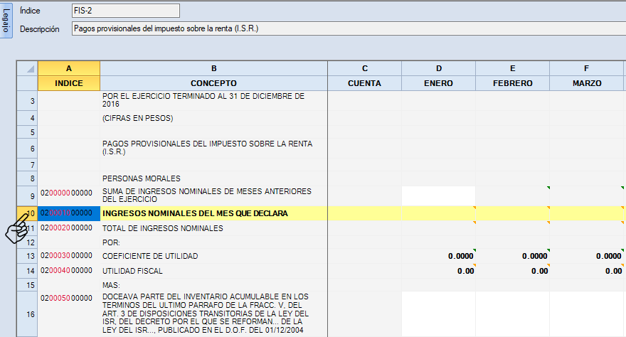 Como ejemplo se muestra el procedimiento con la cédula "Pagos provisionales del impuesto sobre la renta (I.S.R.)". Selecciona la cédula y da clic en el índice, en la columna A.