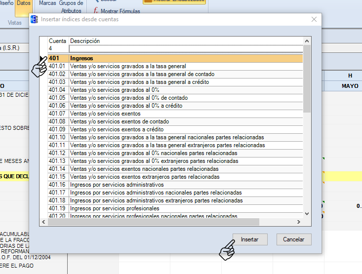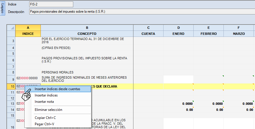 Con esta opción podrás insertar índices (renglones) a partir de cuentas contables. Los índices que permiten insertar cuentas contables son de color amarillo, cabe mencionar que algunos amarillos no lo permiten ya que no lo requieren.