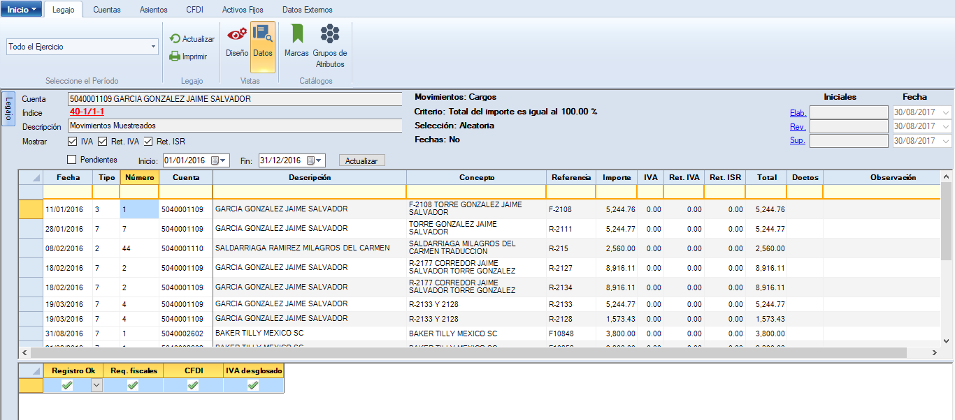 Al seleccionar la carpeta presenta del lado derecho todos los movimientos muestreados independientemente de que cuenta sea. La revisión se hace muy similar a las cédulas analíticas, solo existe una variante que es el atributo de revisión el cuál aparecerá en la parte inferior de la ventana cada vez que se seleccione un movimiento.