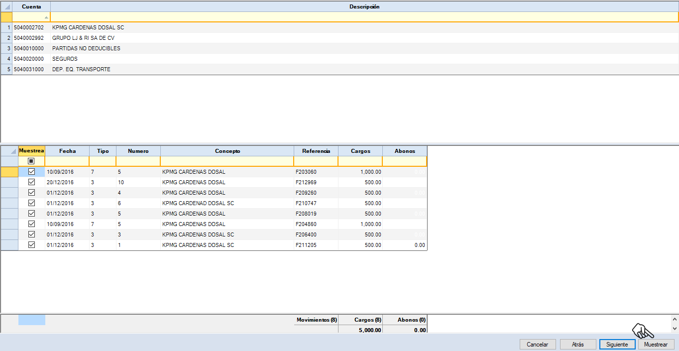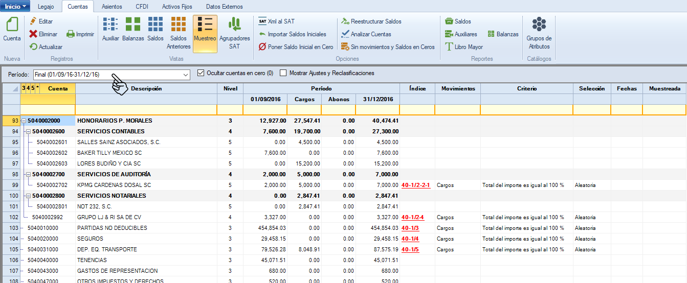 Se presentará la cuenta o cuentas que hayan sido seleccionadas para el muestreo. Además se mostrarán los movimientos que serán parte de la muestra. Da clic en "Muestrear".