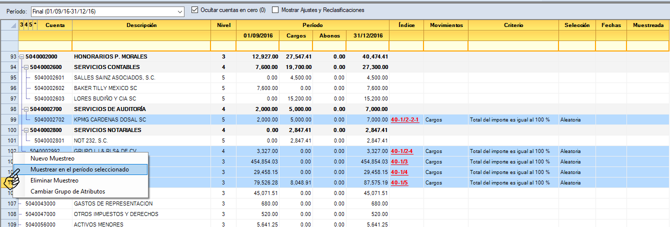Selecciona la cuenta o cuentas que deseas muestrear en el nuevo periodo. Da clic con botón derecho del mouse, del lado izquierdo de la pantalla, a un costado del número de cuenta. Selecciona del menú la opción "Muestrear en el periodo seleccionado".