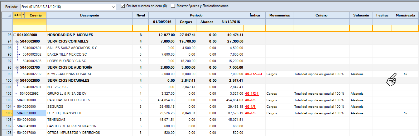 En caso de no aparecer un "Si", en alguna cuenta seleccionada, es muy probable que ya no haya elementos que cumplan criterios del muestreo.