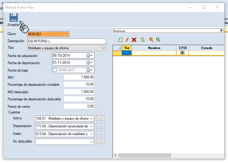Fecha de baja. Captura la fecha de baja del activo fijo (si no se da de baja o se vende no selecionarla).