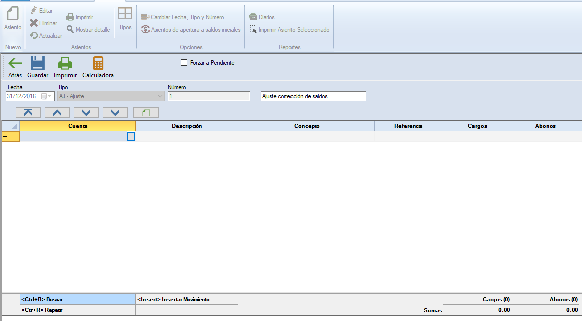 Tipo. Selecciona el tipo de asiento (de acuerdo a la contabilidad que hayas importado). Además podrás seleccionar si es una Ajuste o Reclasificación.
