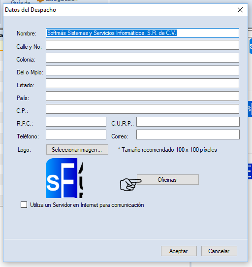 Las oficinas, o sucursales, permiten agregar su propia información general y logotipo. Para darlas de alta da clic en "Datos del Despacho", que se encuentra en "Inicio", para entrar a configurar la información general.