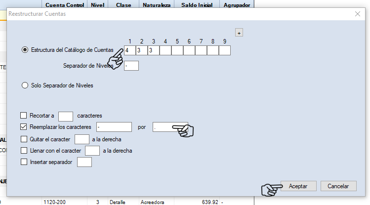Coloca la estructura correcta del catalogo de cuentas. Selecciona la opción "Reemplazar los caracteres _ por _". Captura el caracter que deseas reemplazar y el que quieres salga en su lugar. En el ejemplo se reemplaza el guión por un punto. Si deseas eliminarlo definitivamente no pongas nada después de "por". Da clic en "Aceptar".