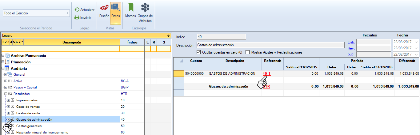 Para visualizar la cédula analítica da clic sobre el índice de la columna “Referencia”. En este ejemplo 40-1/6: