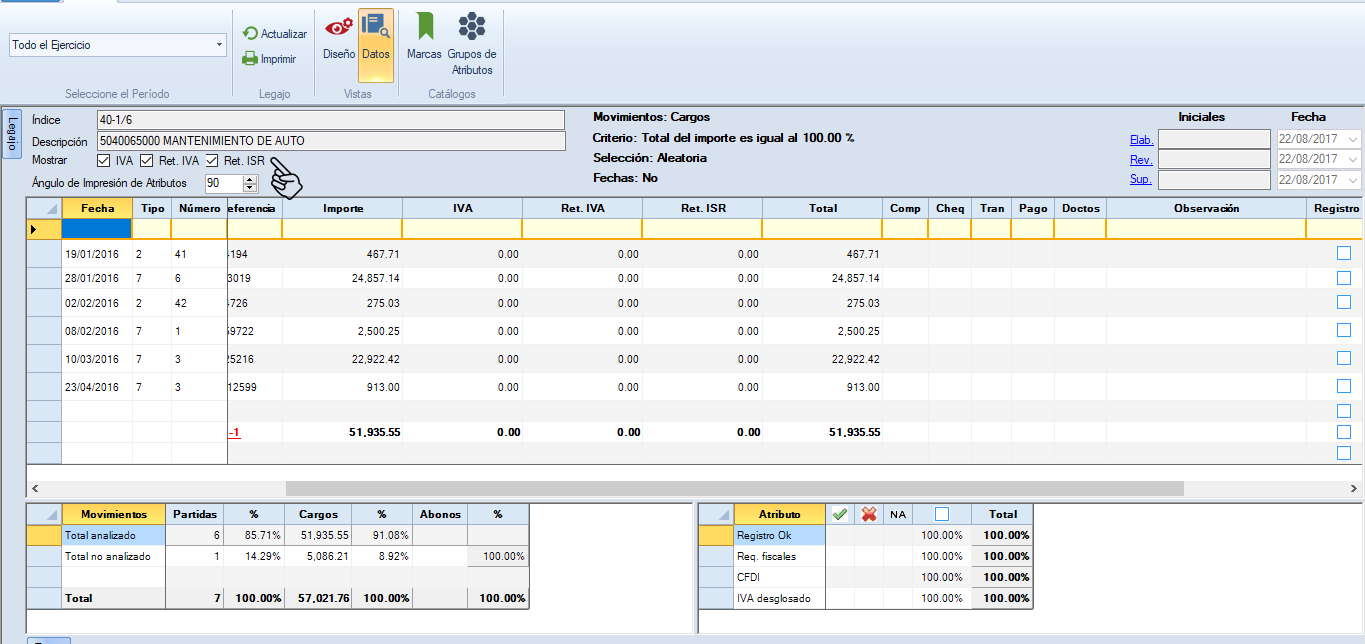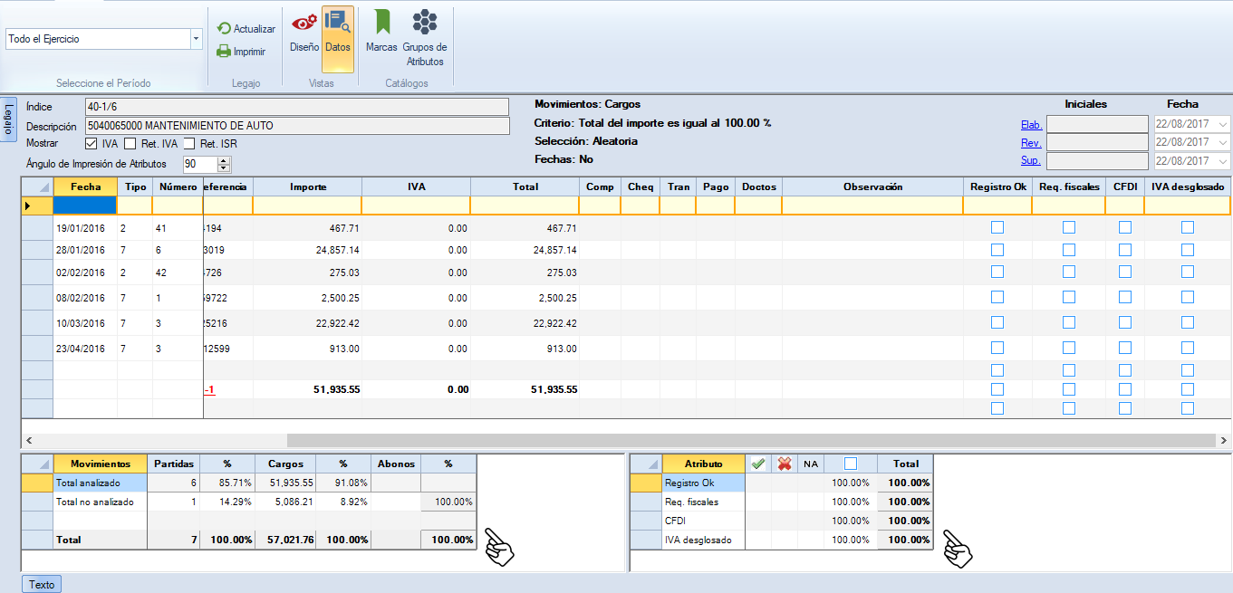 Aquí se observan los movimientos que cayeron en la muestra, sus atributos para revisión y los resúmenes correspondientes.
