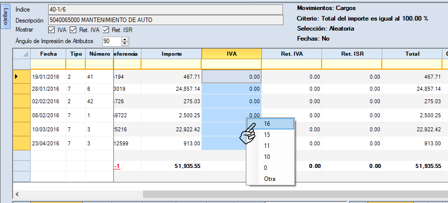 Para llenar las columnas de IVA y retenciones seleccionar la celda o celdas y presionar botón derecho del mouse para elegir del catálogo la tasa correspondiente: