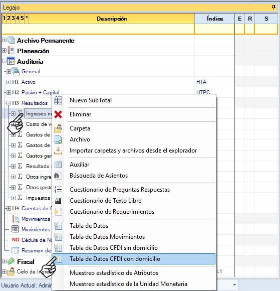 En las tablas de datos se puede importar archivos XML, para realizarlo se debe seleccionar el lugar donde se necesita la tabla. Da clic con el botón derecho del mouse y selecciona “Tabla de Datos CFDI con domicilio” o "Tabla de Datos CFDI sin domicilio".
