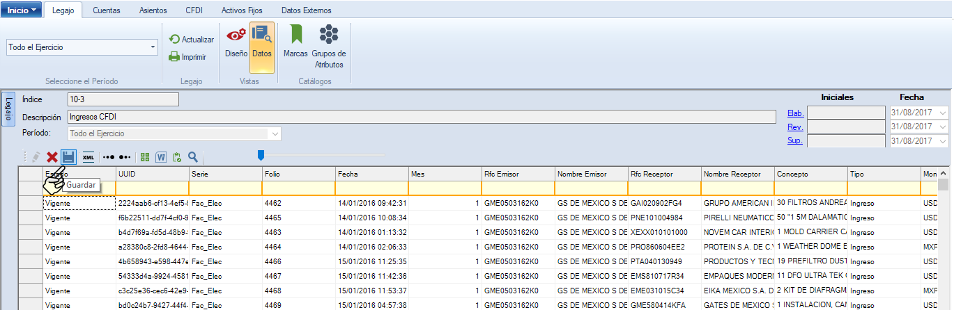 La información es importada a la tabla de datos. Es importante presionar “Guardar” al terminar de importar.