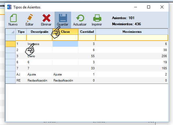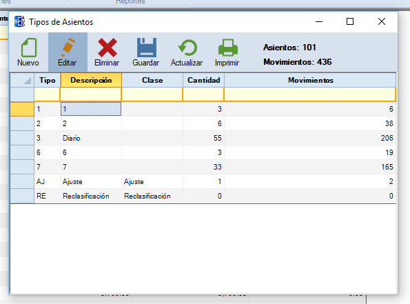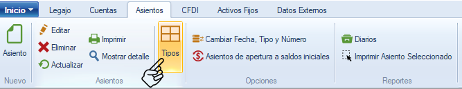 Al importar cualquier contabilidad puedes observar los tipos de asiento que la integran, y en su caso, capturar la descripción que corresponda. Da clic en "Tipos".