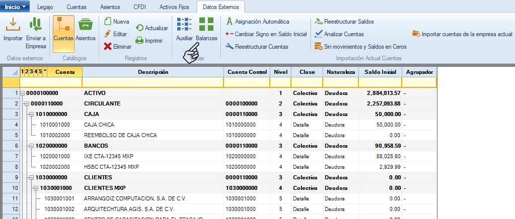 Para salir de la opción de balanzas da clic en el botón “Balanzas” e inmediatamente se regresa la vista al catálogo de cuentas.