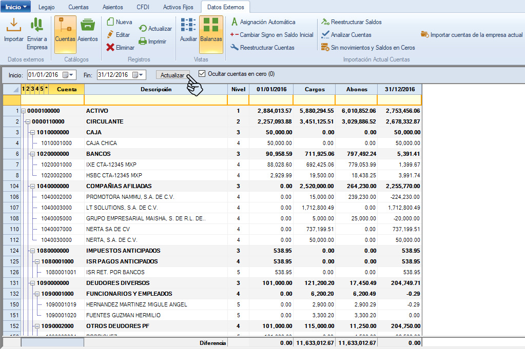 Por default se ocultan las cuentas en cero, para poder verlas se quita la selección dando clic sobre el cuadro con la paloma que indica está activado. Las cuentas en cero serán mostradas.