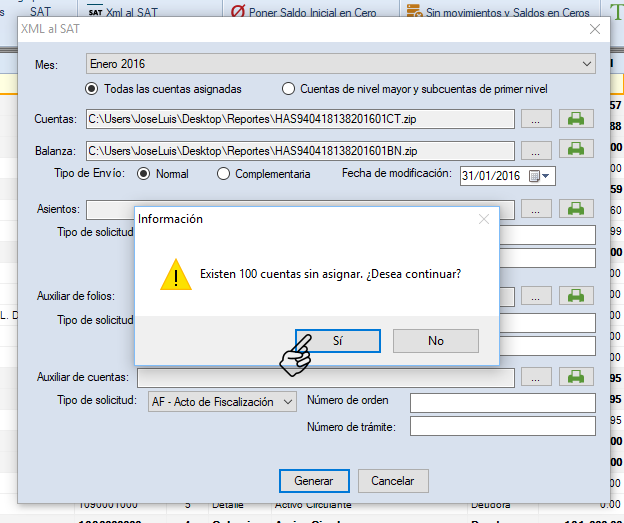 Al terminar de capturar los datos correspondientes da clic en "Generar". Te indicará la cantidad de cuentas que están pendientes de asignar (son las que no se asignan o falta de asignar, según la estructura del catálogo de cuentas). Da clic en "Sí" para continuar.