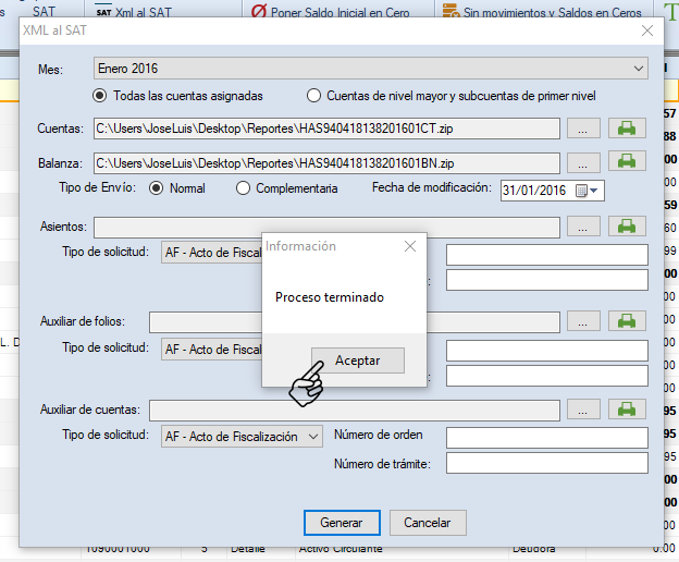 Auxiliar de cuentas. Genera el auxiliar de cuentas que se enviarán al SAT. Indica la ruta donde quieres se guarde el archivo. Selecciona el tipo de solicitud que corresponda.