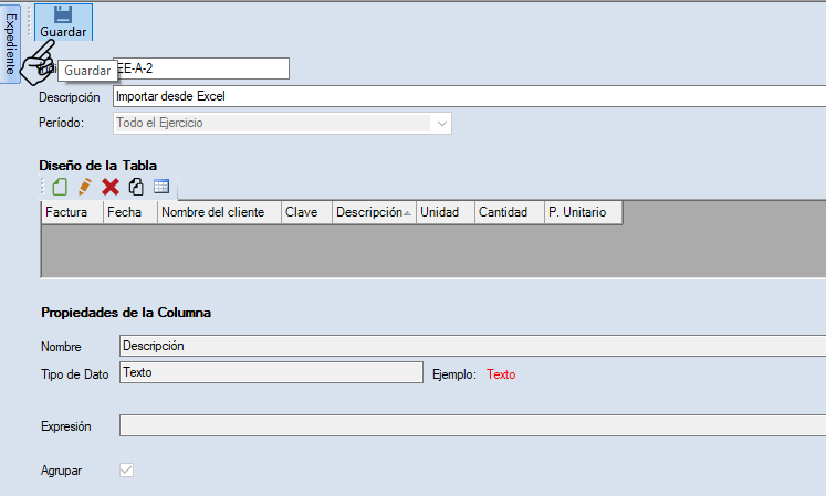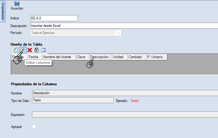 Te permitirá editar la información de las columnas. Para el ejemplo, se selecciona la columna "Descripción". Da clic en "Editar Columna".