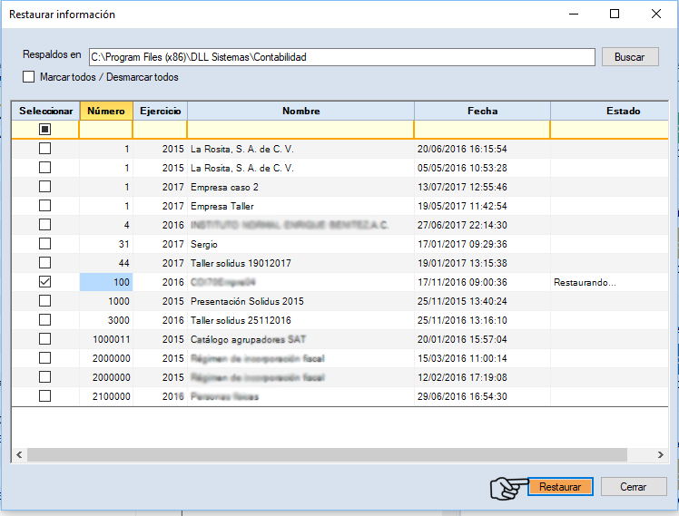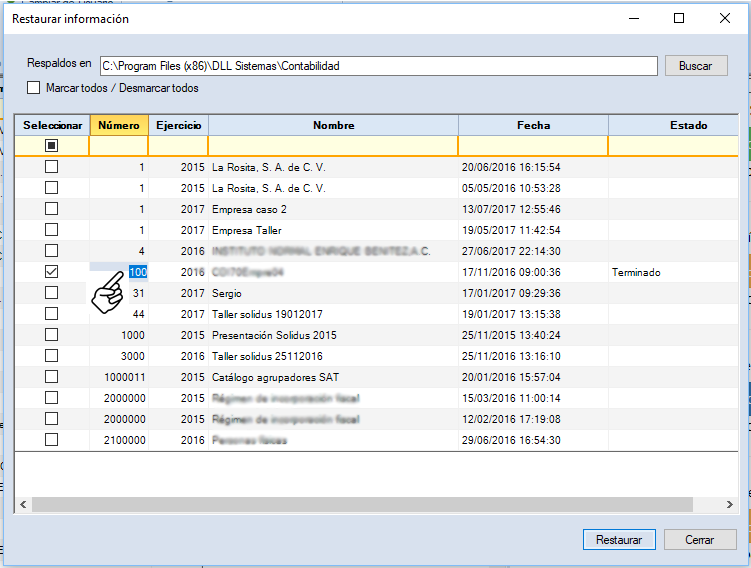 Captura el nuevo número de empresa y da un clic en "Restaurar".