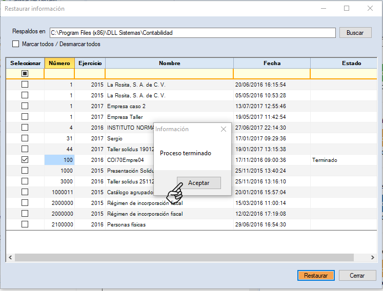 Al concluir se mostrará una ventana indicando "Proceso terminado". Da clic en "Aceptar" para cerrarla. A continuación, si no vas a realizar alguna restauración adicional, da clic en "Cerrar" para salir de la opción de restaurar.