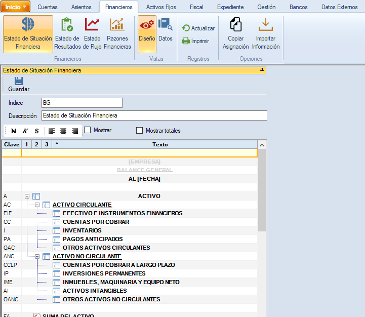 Al cambiar la vista a “Diseño” se presenta la estructura del estado financiero del lado izquierdo.