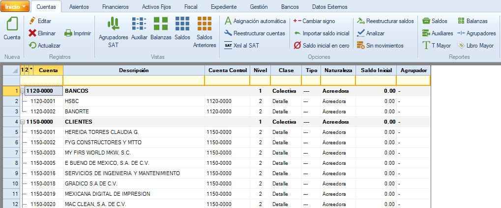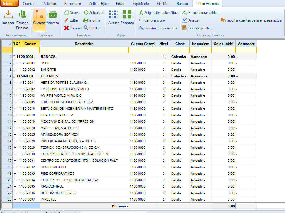 Esta opción permite importar las cuentas contables desde la pestaña "Cuentas" a "Datos Externos" y así realizar la importación exclusivamente de los movimientos contables. En el siguiente ejemplo observarás que ya se tiene un catálogo de cuentas en esa empresa.