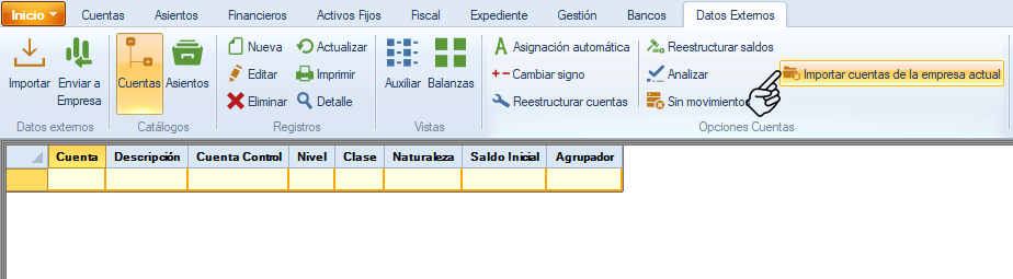 Desde "Datos Externos" da clic en la opción "Importar cuentas de la empresa actual". Deberá estar vacío el catálogo de cuentas.