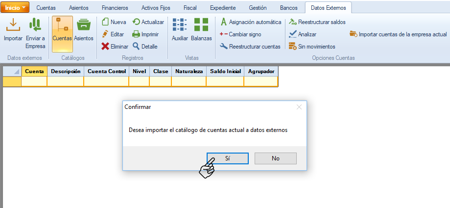 Te mostrará una ventana para confirmar que deseas importar el catálogo de cuentas actual a datos externos. Da clic en "Sí".