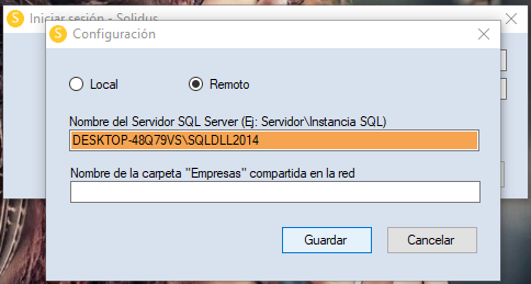 En la siguiente ventana Seleccionamos la opción Remoto, Escribimos el nombre y estancia del equipo servidor (Nombre de mi pc y estancia SQL instalada) y damos clic izquierdo en el botoón Guardar.