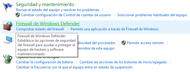 Para esta opción ingresaremos a Firewall desde Panel de control, dando clic en Sistema y seguridad, posteriormente dando clic en Firewall de Windows Defender.