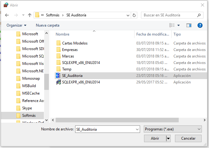 En caso de SE Dictamen y SE Auditoria deben ingresar a la siguiente ruta C:\Program Files (x86)\Softmás\SE Auditoría, que esen donde se encuentran nuestros ejecutables, lo seleccionamos con un clic y damos clic en el botoón Abrir.