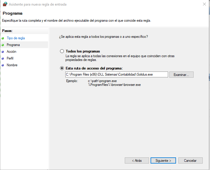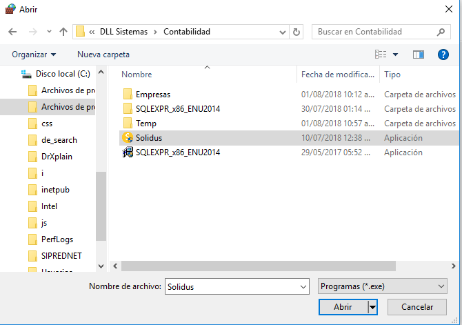 Nos aparece la siguiente ventana donde ingresaremos a la siguiente ruta C:\Program Files (x86)\DLL Sistemas\Contabilidad en caso de Solidus y Gestión donde se encuentra nustro ejecutable lo seleccionamos con un clic y damos clic en Abrir