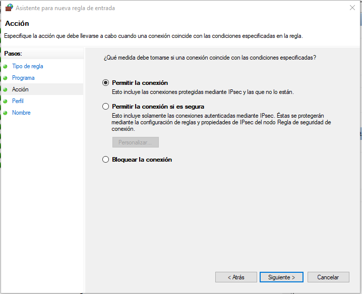 En la siguiente ventana elegimos la opción Permitir la conexión, y damos clic en siguiente.