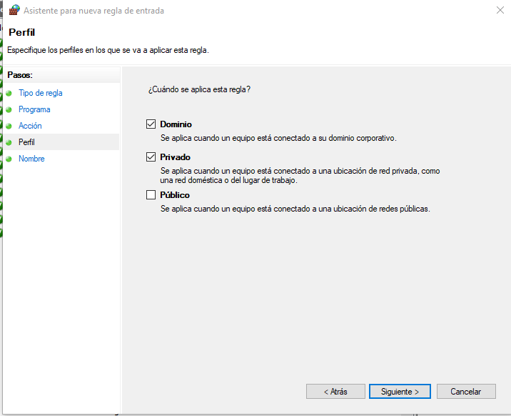 Despues habilitamos la casilla Dominio y Privado como se muestra a continuación y damos clic en Siguiente.